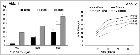 Um den TT-Status von Männern mit und ohne VX zu vergleichen, wurden deskriptive Statistiken verwendet. Eine ANOVA-Analyse wurde durchgeführt, um den Einfluss der VX-Lateralität (unilateral vs. bilateral) auf drei verschiedene TT-Grenzwerte (<200, <300, <400 ng/dl) zu bestimmen.